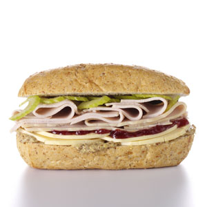 Spread mustard on roll bottom. Layer with cheese, cranberry sauce, turkey and celery. Replace roll top.