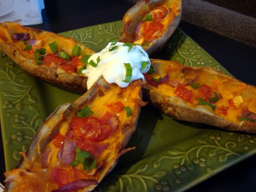 Allow potatoes to cool to the touch. Cut in half lengthwise. Carefully scoop the pulp leaving ¼ inch shell (reserve the pulp for another recipe or discard). Sprinkle the potato with salt and pepper. Add crumbled bacon and green onions, and top off with cheese. Place potato skins on a baking sheet and place under broiler until cheese melts. Potato skins may be served with sour cream, if desired. Yields 6 halves.