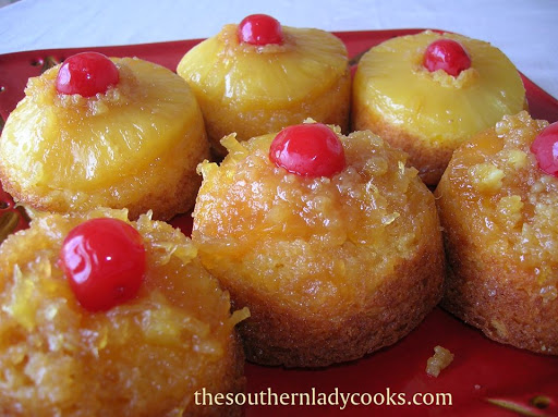 Spray muffin tins well with cooking spray. Melt butter and sugar together on top of the stove. Add 1 tablespoon sugar mixture to each muffin cup. Next, put in 1 tablespoon crushed, drained pineapple or 1 pineapple slice in bottom of each cup. In a large bowl mix cake mix, pudding mix, eggs, oil, juice and milk with mixer. Fill cups 1/2 to 3/4 full with cake mix. Bake in preheated 350 degree oven for 25 minutes. Remove and let cool at least 10 minutes. Run a knife around the edges to loosen muffins from cups before removing. Turn cupcakes upside down on a platter and add cherries. Note: I used one regular 12 cup muffin tin and one large 6 cup tin to make these. This way the recipe made 18 cupcakes.. If just using regular 12 cup tins, it should make about 24 cupcakes. You could use all crushed pineapple or all pineapple rings as well. I wanted to try them both ways to see how they turned out. I think the pineapple rings work better in the larger cup muffin tins.) These would be good topped with whipped cream and you could add nuts to the mix. Enjoy!