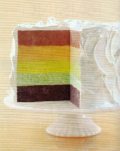 Inspired by a Jell-O recipe from the 1960's, this forzen chiffon cakes gets is color not from gelatin, but from puréed fruit (including blujeberries, kiwifruits, and apricots) whipped into a meringue mixture.