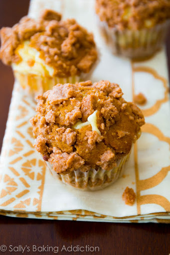 Spoon 1 Tablespoon of pumpkin muffin batter into the muffin cups. Layer with about 1 spoonful (not quite a full Tablespoon) of cheesecake filling, then another Tablespoon of muffin batter (or however much batter is needed to fill the cups all the way to the top). Yes, you will fill the muffin cups to the very top. Some cheesecake filling may poke out of the top or on the sides. Sprinkle each muffin evenly with crumb topping and press the topping down into the muffin so it sticks.