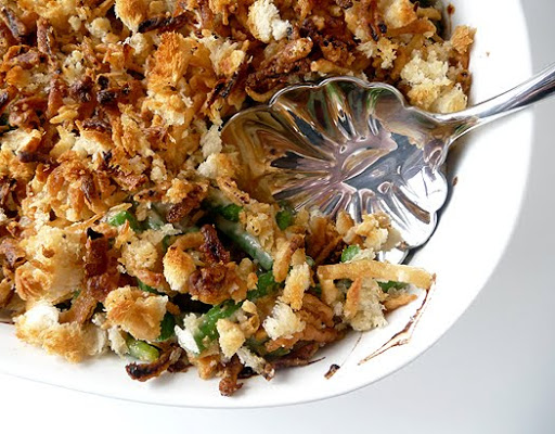 *Note 3: If you want to go 100% homemade and eliminate the canned fried onions, you can make your own caramelized onions. Thinly slice 2 sweet onions and saute in 2 tablespoons of unsalted butter over medium-high heat for about 10 minutes. Reduce heat to medium-low and sprinkle with salt and cook, stirring occasionally, for about 30 minutes, or until the onions are golden, caramelized and soft. Set aside to cool before combining with remainder of crumb topping. Proceed with the recipe as directed.
