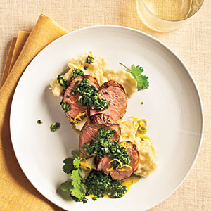 4. Combine 3/4 cup parsley, 1/3 cup cilantro, 1/4 teaspoon salt, oregano, and remaining ingredients in a food processor; pulse 10 times. Drizzle 1/4 cup olive oil through food chute with food processor on. Serve with pork.