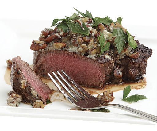 These tender steaks, topped with a tangy blue cheese and toasted nut butter, make for a main course that’s ready in minutes but feels like you fussed.