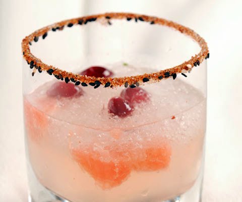 3. To serve, blend drink with crushed ice. Rim glass with togarashi and garnish with cranberry and grapefruit suprêmes.