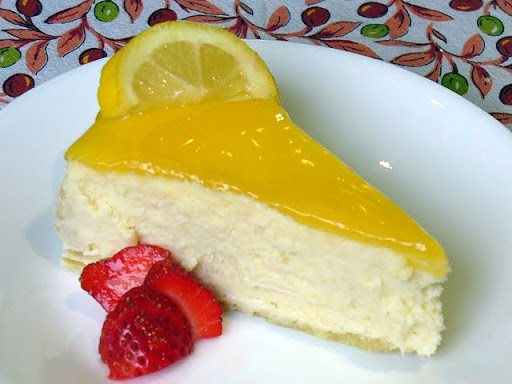 Meanwhile, separate an egg and place the egg yolk in a separate bowl. When the sauce has thickened and starts to be bubbly, then turn down heat. Rapidly stir 2 -3 Tablespoons of the hot mixture into the egg yolks, one Tbsp at a time. Stir quickly so as to prevent the eggs from cooking in the hot liquid. (This is called tempering your eggs). Then when the egg mixture is mixed together add it back into the lemon sauce. Continue cooking for a couple more minutes stirring constantly. Cool it slightly (especially if you have the urge to stick a spoon in and eat some). Spoon the sauce over the cooled cheesecake. Refrigerate until ready to serve. (If you want to freeze this and make it ahead of time, then wait to make the sauce until the day you're going to serve it. Don't freeze with the lemon sauce on top). I promise you're going to love it, especially on a summer day.