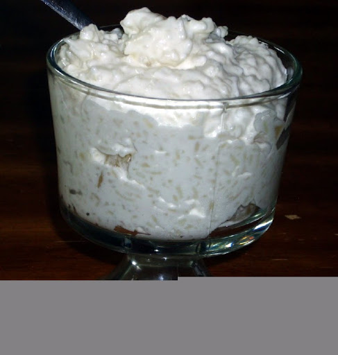 When rice is cold, mix the whipped cream (or whipped topping) with the Greek yogurt.