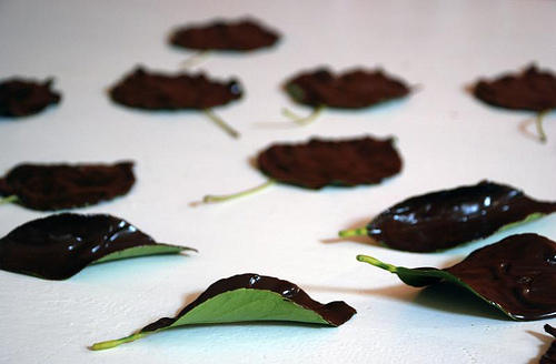 To remove the hardened chocolate from the leaves, start from the stem end and carefully peel the real leaf from the chocolate. Avoid handling the chocolate leaves as much as possible.