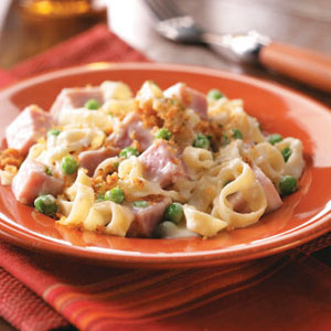 In a large skillet, melt the remaining butter. Stir in flour until smooth; gradually add the milk. Bring to a boil; cook and stir for 2 minutes or until thickened. Stir in cheese; cook 2-3 minutes longer or until melted. Stir in the ham, fettuccine and peas.
