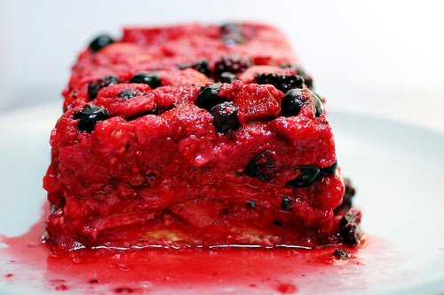 3. Place the loaf pan on a rimmed cookie sheet and use a slotted spoon to place about 2 cups of fruit into the bottom. Lightly soak enough bread slices for one layer in juice and place on top of fruit. Repeat with two more layers of fruit and bread. Top with remaining juices, cover loosely with plastic wrap, and weight with a second cookie sheet and several heavy cans. Refrigerate puddings for at least 8 and up to 24 hours.