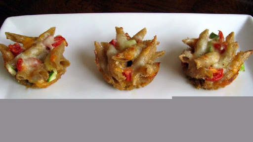 Bring a large pot of salted water to a boil over high heat. Add the pasta and cook until tender but still firm to the bite, stirring occasionally, about 8 to 10 minutes. Drain and add to a large bowl. Stir in the cooked turkey and the cheeses. Season with salt and pepper, to taste. Spoon the prepared pasta mixture into the cupcake molds, filling evenly to about 2/3 full. Arrange a few pieces of tomato, broccoli and asparagus into each cup. Top with a thin layer of the remaining bread crumbs and drizzle with olive oil.