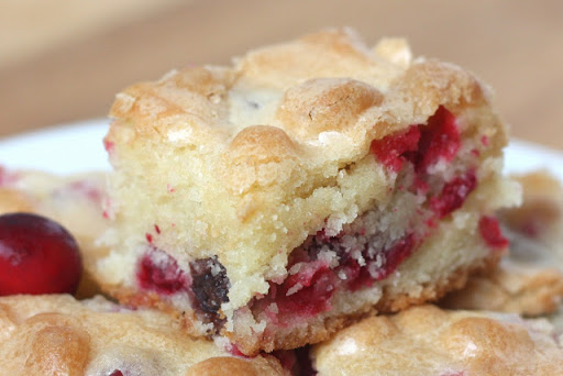 Preheat oven to 350 degrees. With a mixer, beat the eggs with the sugar until slightly thickened and light in color, about 5-7 minutes. The mixture should almost double in size. The eggs work as your leavening agent in this recipe, so do not skip this step. This mixture should form a ribbon when you lift the beaters out of the bowl. Add the butter and vanilla; mix two more minutes. Stir in the flour until just combined. Add the cranberries and stir to mix throughout.