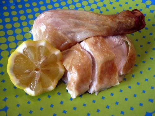 5. Rub the chickens with olive oil, season inside and out with salt and tuck garlic and lemon quarters inside the chicken.