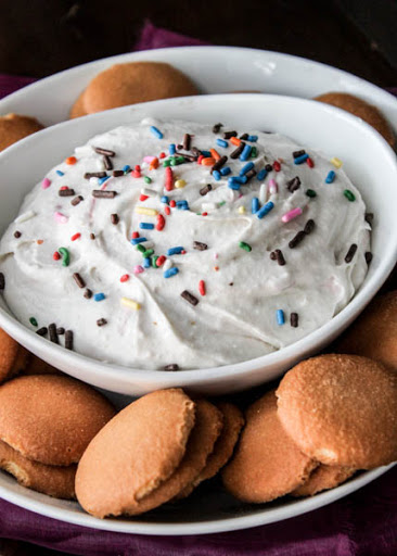 Mix cake mix, yogurt, and cool whip together in a large bowl until there are no lumps. Refrigerate for a few hours before serving. Sprinkle some extra sprinkles over the top then serve with low fat vanilla wafers or graham crackers.