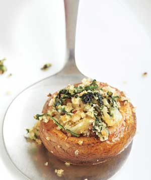 In a bowl, combine the spinach mixture with the bread crumbs and cheese. Spoon into the mushroom caps and bake until golden