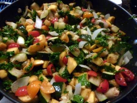 Toss squash, zucchini and onions with seasonings. Saute in 2 T. olive oil until it begins to soften (about 10 minutes). Add chicken stock, lemon juice, and kale and cook another 3 minutes. Add tomatoes and cook another minute or two.