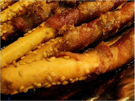 Wrap breadsticks in bacon. Place on cookie sheet and bake for 30 munutes. Dredge through Parmesan while hot. Allow to cool and crisp, then serve.