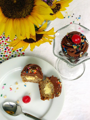 Make cupcakes: Line two muffin tins with paper liners. Preheat oven to 350°F. In a medium bowl, whisk the flour, baking soda and salt together. In a separate, large bowl, beat the butter until creamy. Add the sugar and beat at medium speed until pale and fluffy. Beat in the vanilla, then add the eggs, one at a time, beating for about 1 minute after each egg goes in. Reduce the mixer speed to low and mix in the bananas.