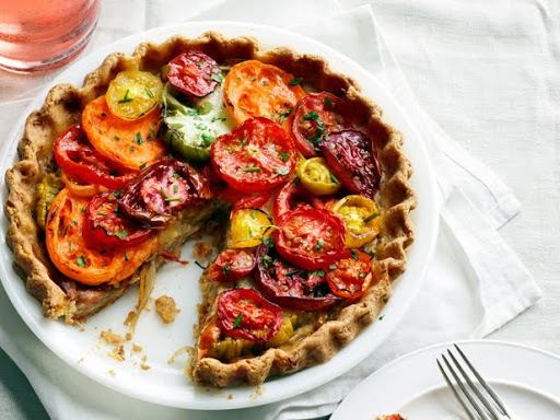 Make the filling: Heat 1 tablespoon olive oil in a large skillet over medium heat. Add the onion and cook, stirring, until golden, about 15 minutes. Let cool. Meanwhile, thinly slice the tomatoes; toss with 1 teaspoon kosher salt in a colander. Let drain, gently tossing occasionally, about 30 minutes.