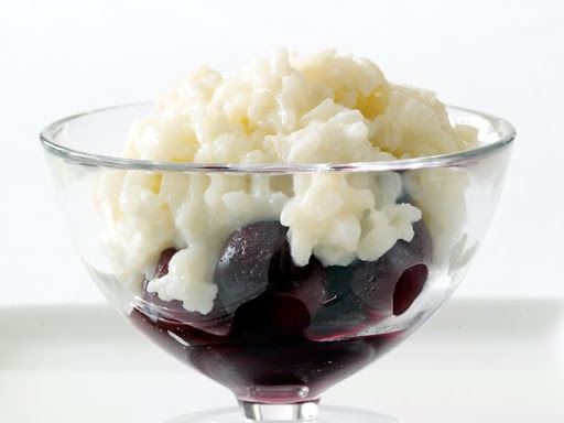 Bring cooked rice, milk, vanilla and salt to a simmer in a saucepan over medium heat. Cook, stirring occasionally, until creamy, 6 to 8 minutes. Remove from the heat, stir in white chocolate chips and let sit a few minutes. Serve over cherries.