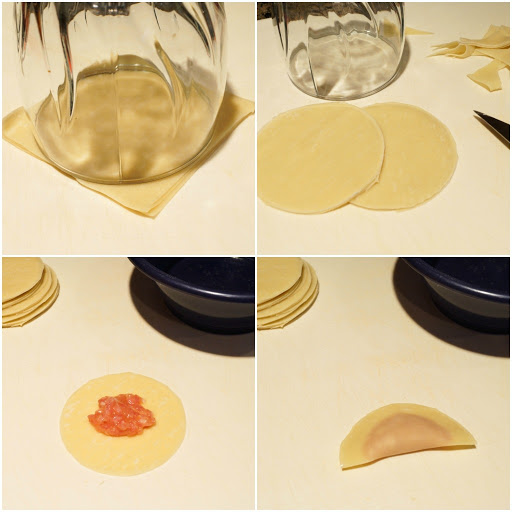 Place wonton wrappers on work surface, covering those not in use with a towel. Fill a small bowl with water. Place a teaspoonful of filling in the center of the wonton wrapper. Dip your finger in the water and wet the edges of the wrapper. Fold in half over the filling, pressing the edges together to seal. Repeat until you run out of wrappers or filling.