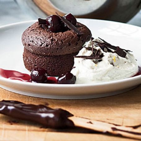 Run the tip of a small knife around each cake to loosen it, then unmold onto plates. Spoon the mascarpone cream onto the cakes and garnish with the brandied cherries and chocolate shavings.