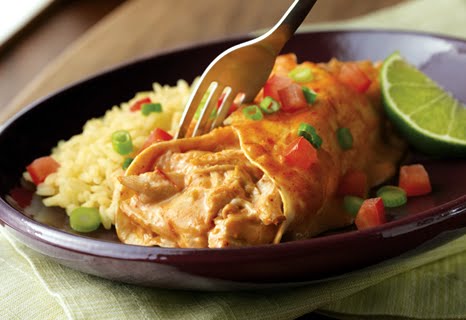 3.Divide the chicken mixture among the tortillas. Roll up the tortillas and place seam-side down in an 11 x 7 x 2-inch baking dish. Pour the remaining soup mixture over the filled tortillas. Cover the baking dish.