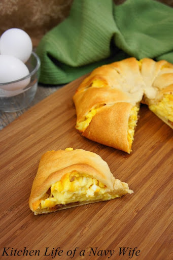 1. Heat oven to 375 degrees. Scramble eggs on stove top. Lay out crescents on a parchment lined pizza pan in a star formation (the longer sides of each crescent on the inside with the pointed ends pointing out.)