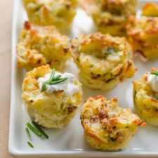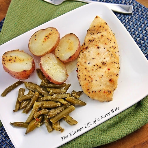 2. Line the opposite side of dish with the potatoes and place the chicken breasts down the middle.