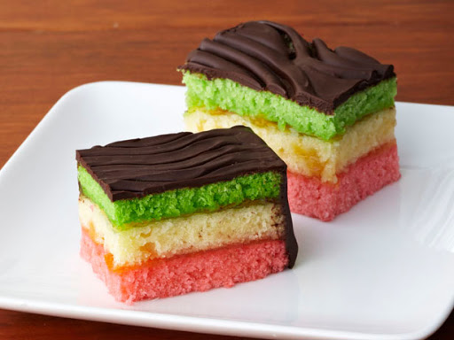 Pour batter evenly into 3 bowls and add 10-12 drops of green, yellow and red food coloring (one color per bowl).