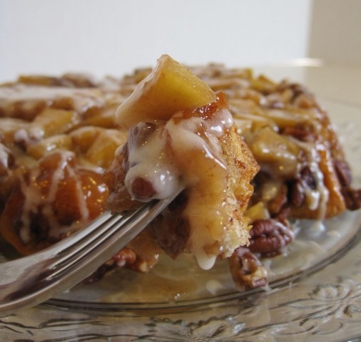 Spread one cup of apples in a 9" glass pie plate sprayed with non-stick vegetable spray. Cut cinnamon rolls into quarters, setting aside icing from tube. Place rolls in a large bowl; add remaining apples and pecans. In a small bowl, combine remaining ingredients; mix well and pour over rolls. Toss gently to combine. Spoon mixture over apples in pan. Bake uncovered, at 350 degrees for 25 to 35 minutes, until rolls are deep golden. Cool for 5 minutes; invert onto a serving platter. Remove lid from icing and microwave for 10 to 15 seconds. Drizzle icing over warm coffee cake. Makes 8 servings