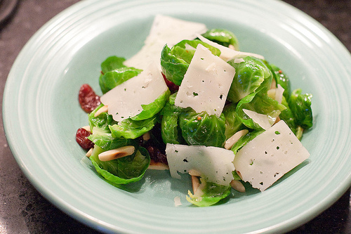 Note: The leaves of 1 pound of Brussels sprouts will make 1 dinner size portion, 2 side salads or 4 smaller appetizer salads. The picture, above, is one of 2 side salads.