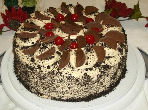 Spread cake with frosting and sprinkle all over with chocolate sandwich cookie crumbs. Garnish with chopped peanut butter cups and warmed fudge frosting or as desired.