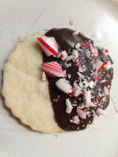 Melt chocolate per instructions. Crush candy canes and place in a bowl. Dip half of each cookie into melted candy melts ;allow excess to drip off. Sprinkle with crushed peppermint candy canes. Place on waxed paper until set.