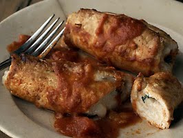 Remove the chicken from the pan. Season the tomato sauce with salt and pepper. Spoon the tomato sauce onto serving plates or a serving platter. Slice the chicken into 1-inch rounds. Remove the toothpicks. Place the chicken over the sauce and serve immediately.