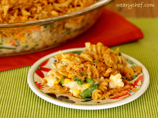 Stir together soup, milk, 1 cup French-fried onions, vegetables, chicken (or turkey), cooked noodles, and 1/2 cup cheese in a large mixing bowl. Transfer to prepared baking dish, and bake in preheated oven for 30 minutes