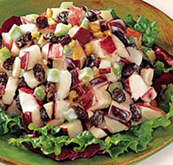 Soak raisins in hot water. Drain well, then combine apples, celery and raisins. Whisk together remaining ingredients and add the apple mixture. Chill before serving.