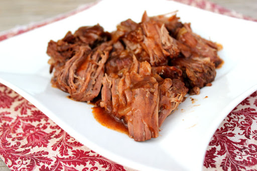 Pour the yummy sauce over the top of the browned meat. Cover the crock pot and on low for 5 hours, or until the meat easily shreds with a fork.