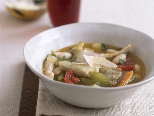 3. POUR in broth. Add chicken, tomatoes, zucchini, beans, and artichoke hearts. Simmer 30 minutes. Remove and discard bay leaf. Add oregano, sage, and thyme and simmer an additional 5 minutes. Top each bowl with 2 slices of cheese, if desired.