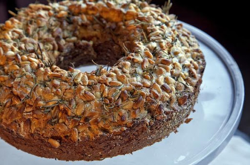 7. Sprinkle the pinenuts and the remaining one-half cup sugar over the cakes, then garnish with rosemary.
