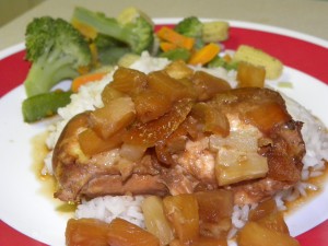Chop onion and place in crock pot. Place Chicken Breast on top of onion. Dump the can of pineapple (juice and all) over the chicken. Dump the soy sauce and the chicken broth on top of everything. Cover and cook on HIGH in the crockpot for 4-5 hours or on low for 6-8 hours. Serve over rice and with a steamed veggie.