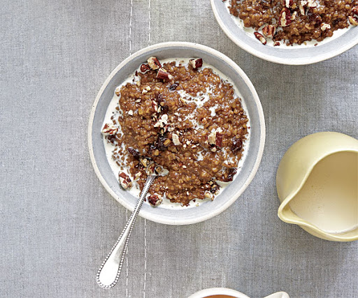 Rich with molasses and warming spices, this oatmeal brings to mind old-fashioned gingerbread. A quick boil at night and an overnight lounge in the fridge means the notoriously slow-cooking grains need only 10 minutes of simmering. Serve with a drizzle of cream and, if you like, chopped, toasted pecans or walnuts.