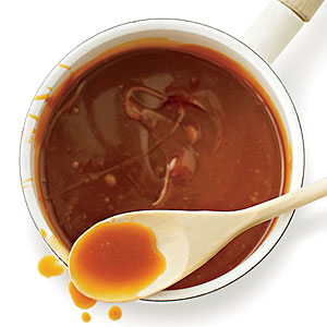 2. Remove lid. Boil, gently swirling often and checking color and temp every 5 to 10 seconds, about 4 minutes or until a candy thermometer reaches 345° to 350° and mixture is medium to dark amber. Remove from heat.