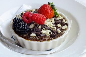 Milk Chocolate Custard, dusted with Sugar and Caramelized into a Crispy Candy Glaze, topped with Fresh Berries and Whipped Cream