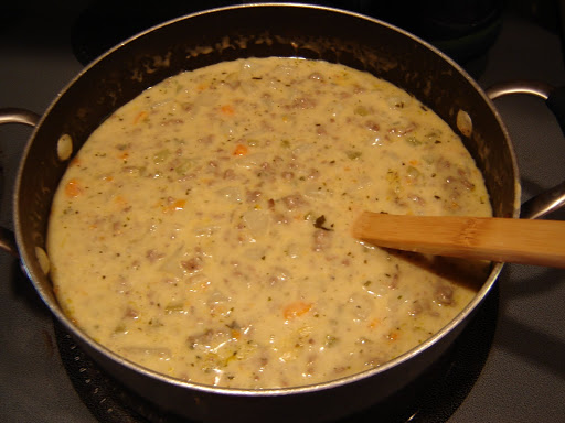 Brown hamburger in 3 qt saucepan. Drain and set a side. In same pan add 2 tbs butter and add onion, carrots, parsley, basil and celery saute until tender. Add broth, potatoes and beef bring to a boil. Reduce heat cover and simmer 10-12 minutes until potatoes are tender. In small skillet melted remaining butter and add the flour. Cook and stir for 3-5 minutes or until bubbly. Add to soup and bring to a boil. Reduce heat to low stir in cheese, milk, salt and pepper until cheese melts.