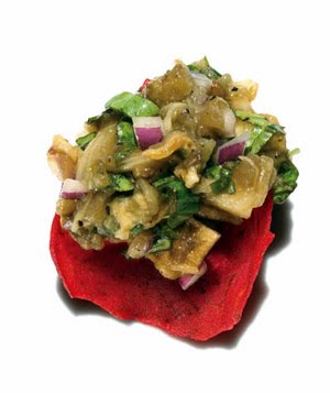 In a medium bowl, stir together the eggplant, onion, basil, oil, vinegar, ¾ teaspoon salt, and ¼ teaspoon pepper. Serve with the vegetable chips.