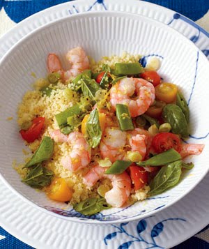 Meanwhile, in a medium bowl, combine the shrimp, snap peas, tomatoes, basil, scallions, oil, lemon zest and juice, ¾ teaspoon salt, and ¼ teaspoon pepper and toss to combine. Serve over the couscous.