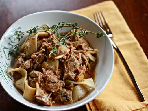 Turn on low and cook 8 to 10 hours, until tender. Discard thyme. Shred meat, add sour cream and stir to combine. Taste and season with additional salt and pepper, if needed. Serve on top of egg noodles.