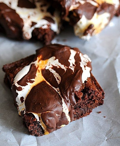 While still slightly warm add a spoonful of marshmallow fluff onto each brownie. How many brownies you get depends on how big you cut your brownie. I cut mine pretty big.