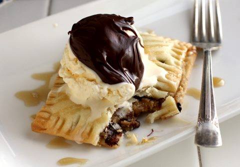 Cut a pie crust into four small rectangles, then spoon the chocolate chip cookie dough mixture on top of two of the pie crusts. Place the second pie crust on top of each “filled” crust. Use a fork to press down the edges.